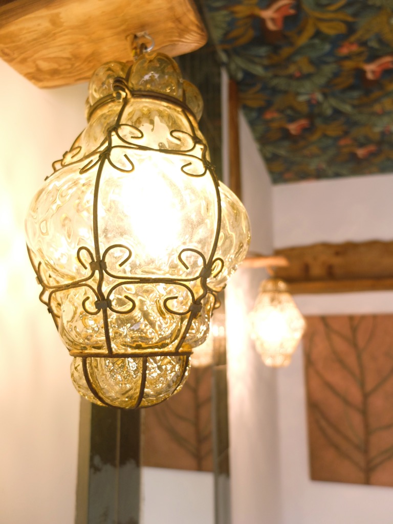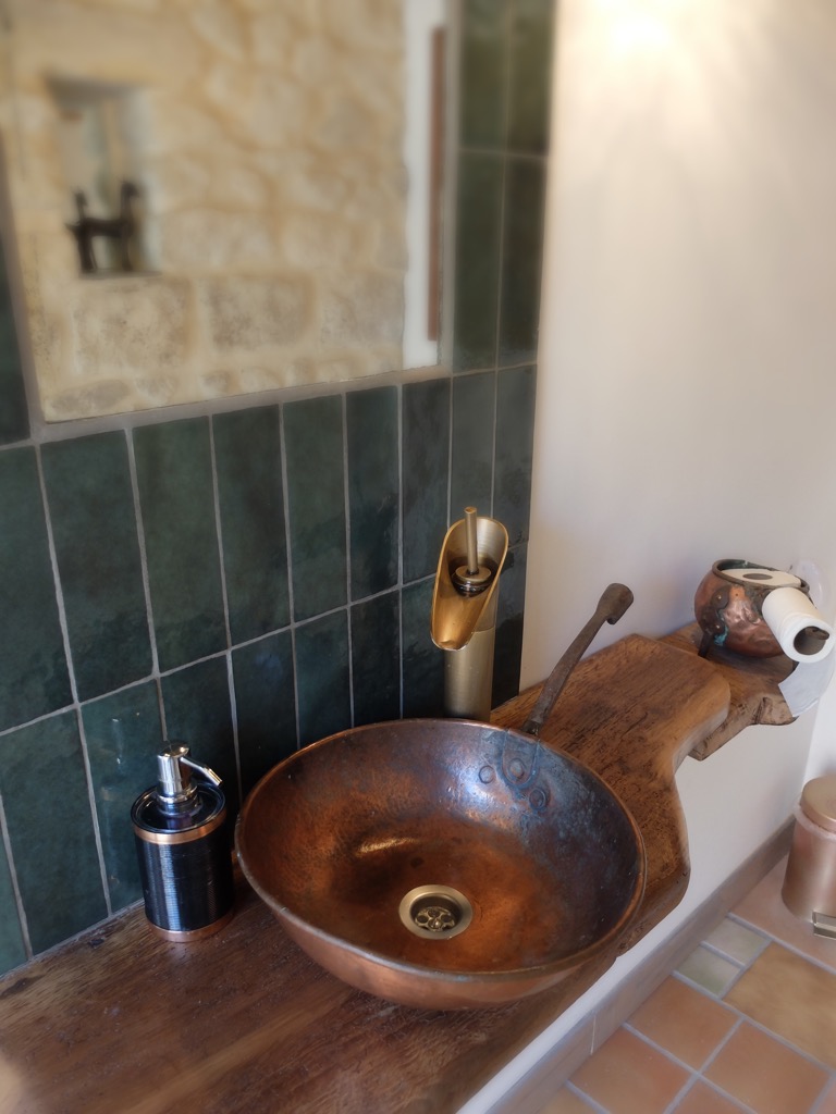 We’ve had a bit of fun, using an old copper pan for the sink and some beautiful glass pendant lights we picked up in a local brocante.