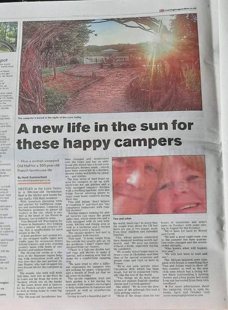 The reporter who spoke to my Mum on the call was so intrigued about my Mum’s story of her moving to France and starting a Campsite business here, that she asked to feature her and the site in the following weeks’ paper…