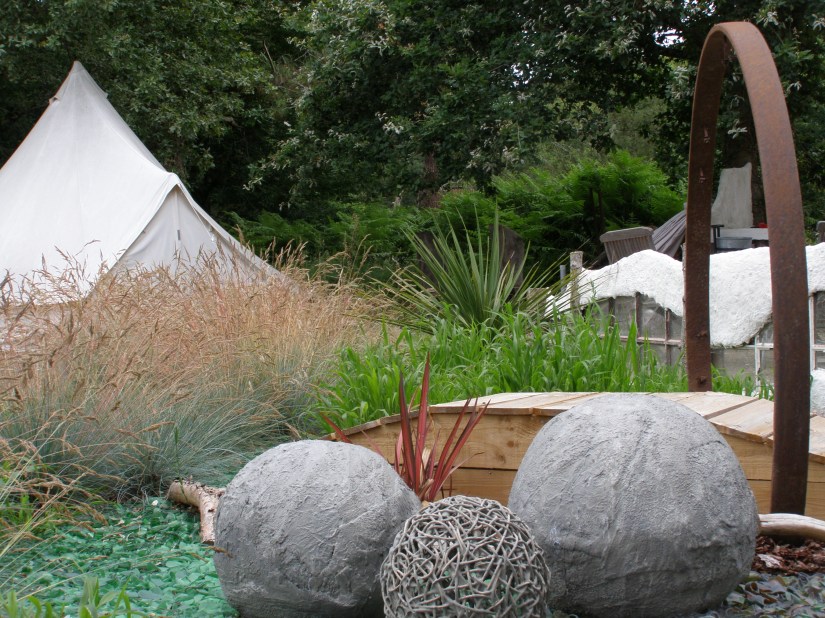 Then there is the glass from all the wine bottles. I used the cement mixer with a water and sand slurry to polish the broken glass and take all the sharp edges off. Its now an ornamental dressing to keep the weeds down. You can see it around the balls on the picture above.